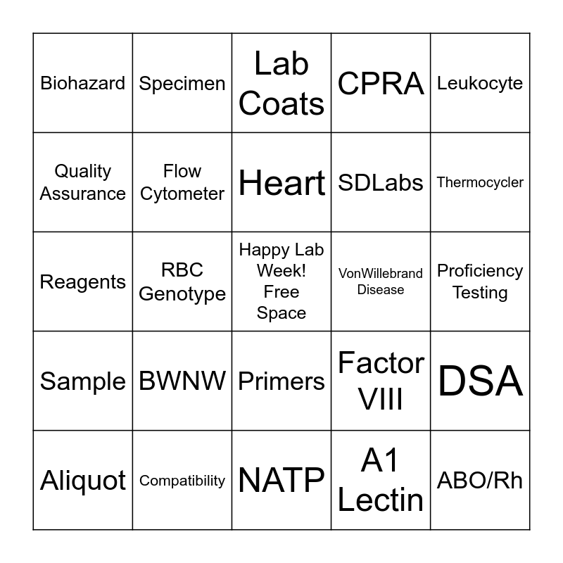 This bingo card has a free space and 57 words: ACD, Aliquot, Clot, Biohazard, NATP, Matched Platelets, Flow Cytometer, Inspection, SDLabs, Centrifuge, CPRA, NATP, Hemophilia A, Hemophilia B, Coagulation, HPA, Leukocyte, RBC Genotype, Gloves, ABO/Rh, VonWillebrand Disease, Immunology, Factor VIII, Lab Coats, Kidney, Heart, Lung, Liver, Thermocycler, Freezer, Sodium Citrate, Pipette, Hemostasis, Genomics, Proficiency Testing, Quality Assurance, Quality Control, Reagents, Platelets, Sample, Specimen, Primers, Luminex, EDTA, Crossmatch, Antibody, BWNW, Compatibility, PCR, CBC, Coagulation, A1 Lectin, HLA-Class I, HLA-Class II, Thrombosis, DSA and ADAMTS.