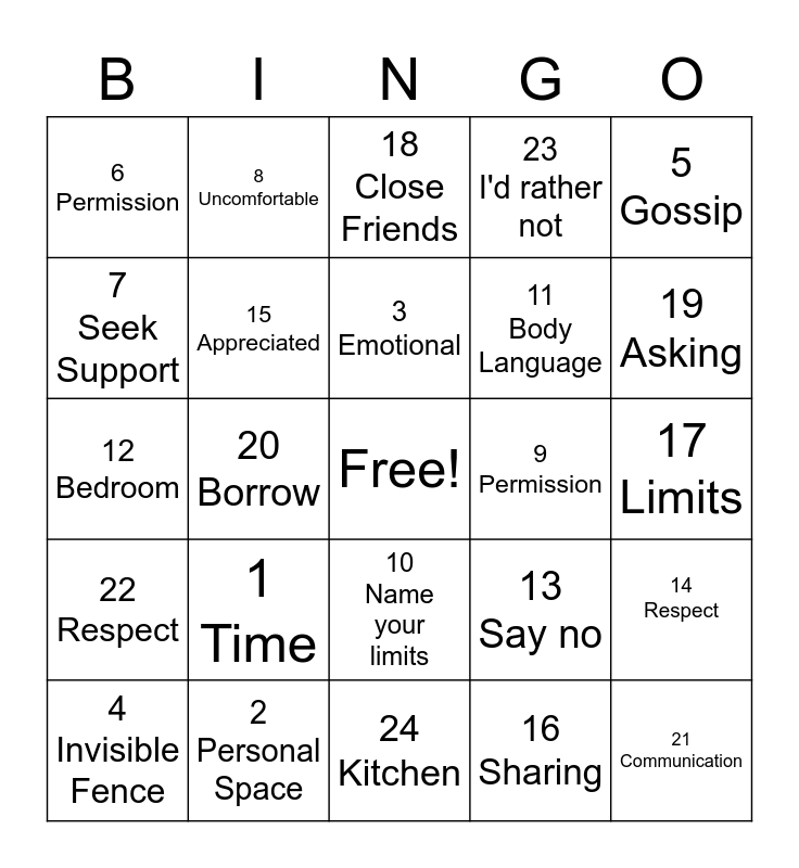 This bingo card has a free space and 24 words: 1 Time, 2 Personal Space, 3 Emotional, 4 Invisible Fence, 5 Gossip, 6 Permission, 7 Seek Support, 8 Uncomfortable, 9 Permission, 10 Name your limits, 11 Body Language, 12 Bedroom, 13 Say no, 14 Respect, 15 Appreciated, 16 Sharing, 17 Limits, 18 Close Friends, 19 Asking, 20 Borrow, 21 Communication, 22 Respect, 23 I'd rather not and 24 Kitchen.