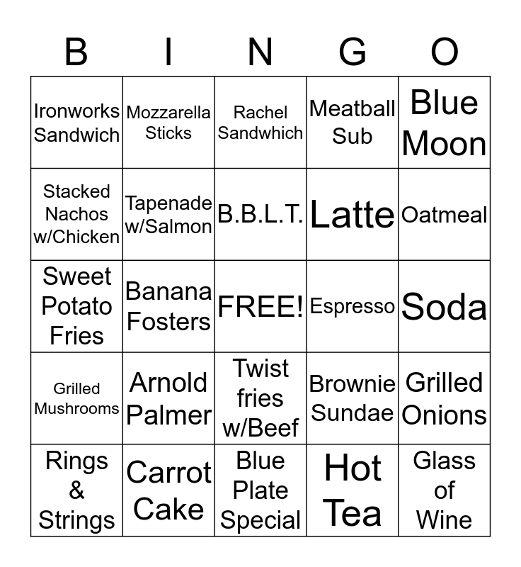 This bingo card has a free space and 24 words: Arnold Palmer, Carrot Cake, B.B.L.T., Rings & Strings, Blue Moon, Ironworks Sandwich, Stacked Nachos w/Chicken, Mozzarella Sticks, Espresso, Twist fries w/Beef, Latte, Sweet Potato Fries, Brownie Sundae, Grilled Onions, Tapenade w/Salmon, Hot Tea, Soda, Rachel Sandwhich, Oatmeal, Banana Fosters, Glass of Wine, Grilled Mushrooms, Meatball Sub and Blue Plate Special.