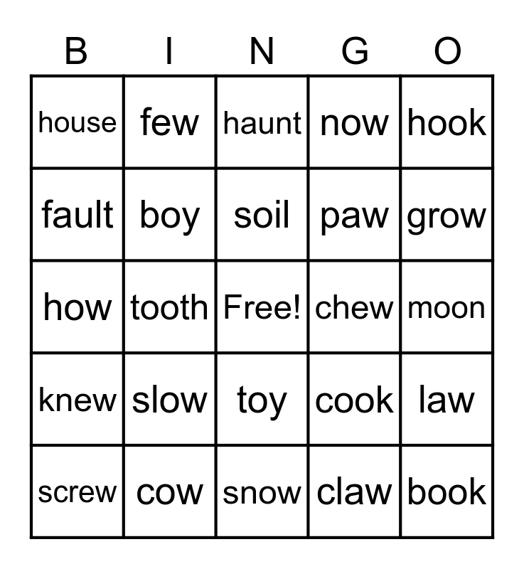This bingo card has a free space and 28 words: law, saw, paw, claw, fault, haunt, few, knew, chew, screw, how, now, cow, snow, grow, brown, slow, boy, soil, toy, house, mouth, book, tooth, moon, cook, hook and town.