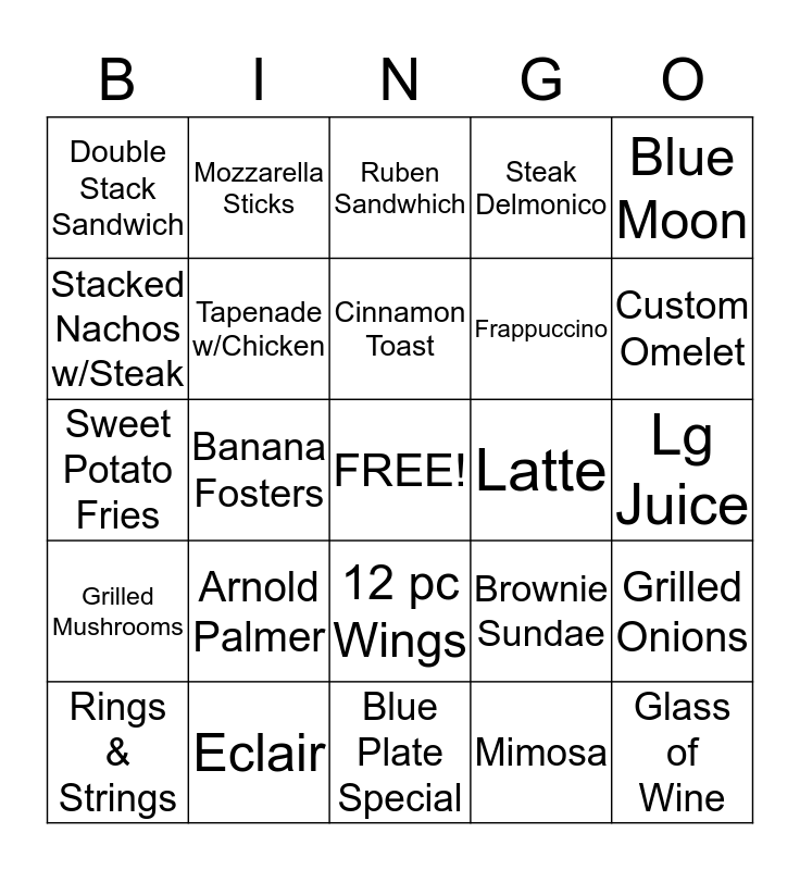This bingo card has a free space and 24 words: Arnold Palmer, Eclair, Cinnamon Toast, Rings & Strings, Blue Moon, Double Stack Sandwich, Stacked Nachos w/Steak, Mozzarella Sticks, Latte, 12 pc Wings, Frappuccino, Sweet Potato Fries, Brownie Sundae, Grilled Onions, Tapenade w/Chicken, Mimosa, Lg Juice, Ruben Sandwhich, Custom Omelet, Banana Fosters, Glass of Wine, Grilled Mushrooms, Steak Delmonico and Blue Plate Special.