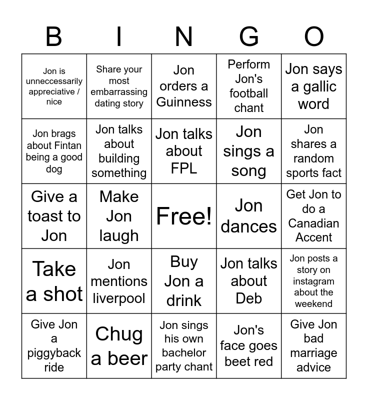 This bingo card has a free space and 24 words: Jon mentions liverpool, Chug a beer, Jon talks about FPL, Give Jon a piggyback ride, Jon says a gallic word, Jon is unneccessarily appreciative / nice, Jon brags about Fintan being a good dog, Share your most embarrassing dating story, Jon dances, Buy Jon a drink, Jon sings a song, Give a toast to Jon, Jon talks about Deb, Jon posts a story on instagram about the weekend, Jon talks about building something, Jon's face goes beet red, Get Jon to do a Canadian Accent, Jon orders a Guinness, Jon shares a random sports fact, Make Jon laugh, Give Jon bad marriage advice, Take a shot, Perform Jon's football chant and Jon sings his own bachelor party chant.