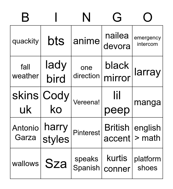 This bingo card has a free space and 24 words: wallows, harry styles, one direction, kurtis conner, emergency intercom, quackity, bts, anime, lil peep, manga, skins uk, lady bird, British accent, english > math, fall weather, Sza, speaks Spanish, nailea devora, larray, Antonio Garza, Cody ko, Pinterest, black mirror and platform shoes.