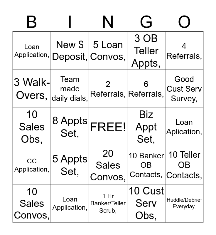 This bingo card has a free space and 24 words: 5 Appts Set,, Loan Application,, 2 Referrals,, 10 Sales Convos,, 4 Referrals,, Loan Application,, 3 Walk-Overs,, New $ Deposit,, Biz Appt Set,, 20 Sales Convos,, 6 Referrals,, 10 Sales Obs,, 10 Banker OB Contacts,, 10 Teller OB Contacts,, Team made daily dials,, 10 Cust Serv Obs,, Loan Aplication,, 5 Loan Convos,, Good Cust Serv Survey,, 8 Appts Set,, Huddle/Debrief Everyday,, CC Application,, 3 OB Teller Appts, and 1 Hr Banker/Teller Scrub,.