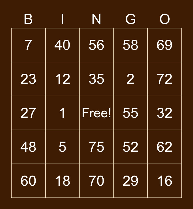 This bingo card has a free space and 24 words: 5, 18, 35, 60, 69, 7, 23, 40, 55, 75, 2, 27, 52, 62, 12, 29, 32, 56, 72, 1, 16, 48, 58 and 70.