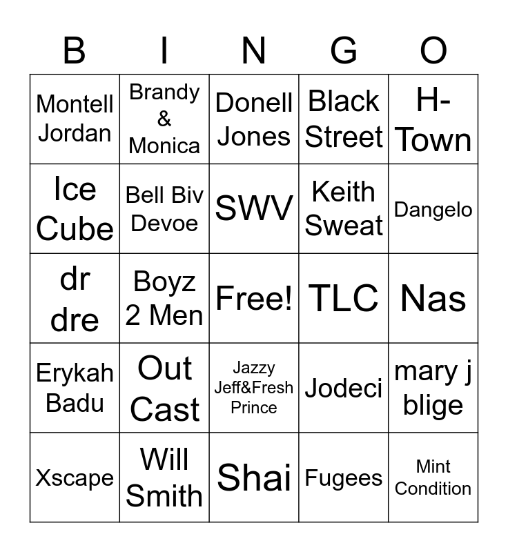 This bingo card has a free space and 39 words: Adina Howard, Salt n Pepper, Freak Nasty, Bell Biv Devoe, Xscape, Jazzy Jeff&Fresh Prince, SWV, Janet Jackson, H-Town, Erykah Badu, Boyz 2 Men, Black Street, Mint Condition, Nas, TLC, Out Cast, Silk, Montell Jordan, Guy, Jodeci, Ice Cube, Shai, Keith Sweat, Dangelo, Aaliyah, Destiny Child, Krs One, 2pac, Pete Rock, Brandy & Monica, Eric B & Rakim, Whitney Houston, Donell Jones, Will Smith, Fugees, Biz markie, mary j blige, dr dre and all 4 one.