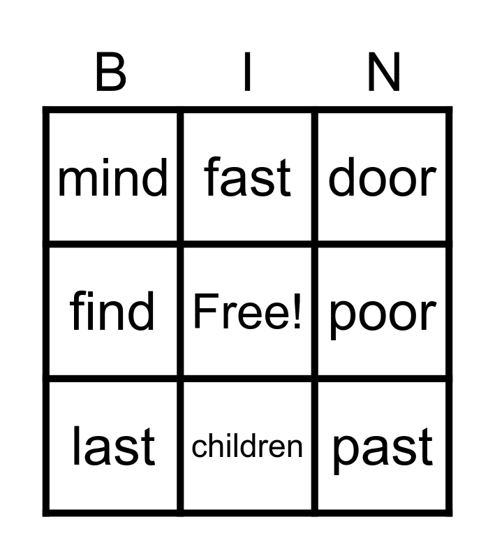 This bingo card has a free space and 11 words: child, children, past, last, fast, door, poor, kind, find, mind and school.