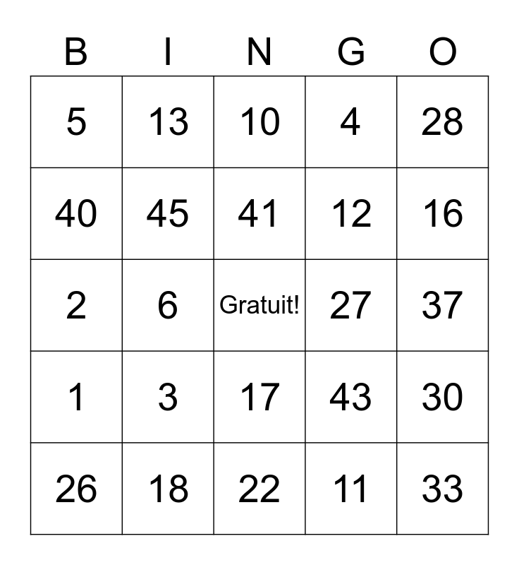 This bingo card has a free space and 24 words: 3, 18, 41, 26, 28, 5, 40, 13, 27, 17, 12, 2, 43, 30, 45, 11, 37, 10, 16, 6, 33, 1, 4 and 22.