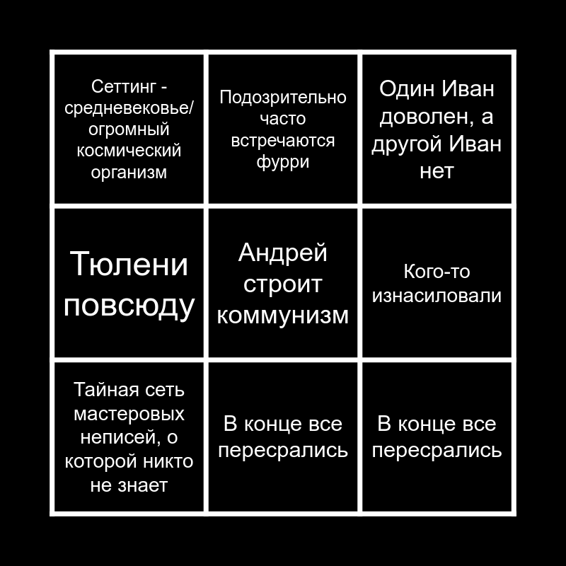 This bingo card has a free space and 8 words: Кого-то изнасиловали, Один Иван доволен, а другой Иван нет, Подозрительно часто встречаются фурри, Тайная сеть мастеровых неписей, о которой никто не знает, Сеттинг - средневековье/огромный космический организм, В конце все пересрались, Тюлени повсюду and В конце все пересрались.