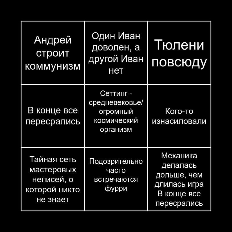 This bingo card has 9 words: Тайная сеть мастеровых неписей, о которой никто не знает, Тюлени повсюду, Один Иван доволен, а другой Иван нет, В конце все пересрались, Андрей строит коммунизм, Кого-то изнасиловали, Сеттинг - средневековье/ огромный космический организм, Механика делалась дольше, чем длилась игра В конце все пересрались and Подозрительно часто встречаются фурри.