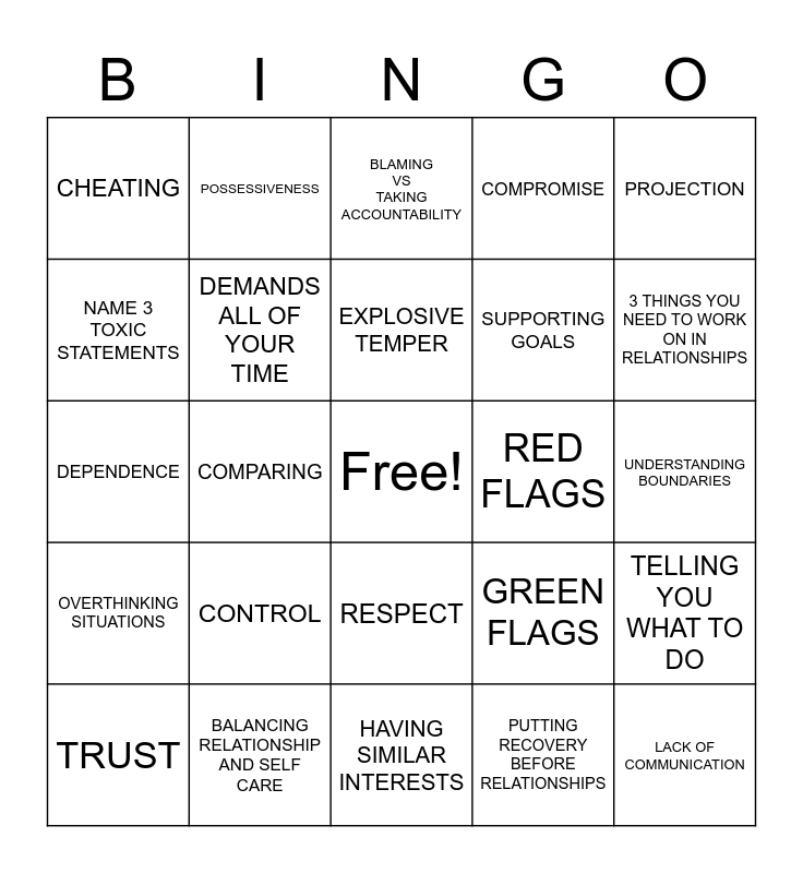 This bingo card has a free space and 29 words: TRUST, JEALOUSY, COMPARING, CODEPENDENCE, CHEATING, BLAMING VS TAKING ACCOUNTABILITY, DEMANDS ALL OF YOUR TIME, CONTROL, RED FLAGS, BALANCING RELATIONSHIP AND SELF CARE, UNDERSTANDING BOUNDARIES, LACK OF COMMUNICATION, HAVING SIMILAR INTERESTS, PUTTING RECOVERY BEFORE RELATIONSHIPS, 3 THINGS YOU NEED TO WORK ON IN RELATIONSHIPS, TOXIC, RESPECT, OVERTHINKING SITUATIONS, PROJECTION, DEPENDENCE, GREEN FLAGS, PUTTING YOURSELF IN THEIR SHOES, SUPPORTING GOALS, NAME 3 TOXIC STATEMENTS, COMPROMISE, POSSESSIVENESS, TELLING YOU WHAT TO DO, EXPLOSIVE TEMPER and FINDING THE RIGHT TIME.