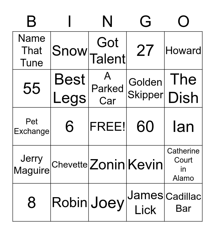 This bingo card has a free space and 28 words: Catherine Court in Alamo, 22, Golden Skipper, James Lick, 55, Got Talent, Snow, Jerry Maguire, 60, 8, Pet Exchange, 27, Robin, Joey, The Dish, Lady Frances, Chevette, Best Legs, A Parked Car, Zonin, Name That Tune, 1615, Cadillac Bar, 6, Ian, Kevin, Howard and Natalie.