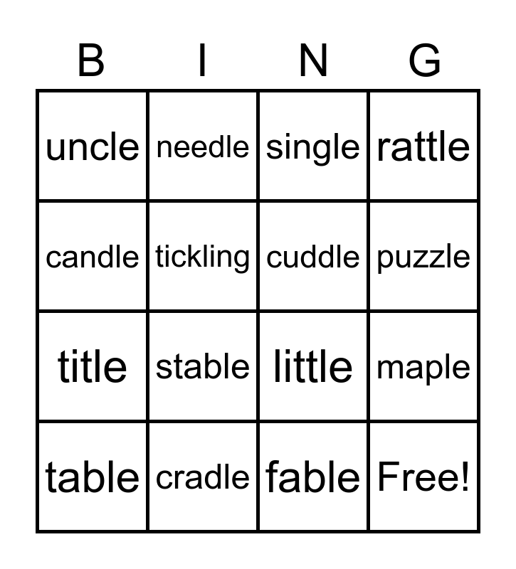 This bingo card has 23 words: Free!, middle, puzzle, giggled, candle, uncle, tickling, needle, table, able, stable, title, syllable, eagle, cradle, staple, single, little, cuddle, maple, rattle, fable and pickle.