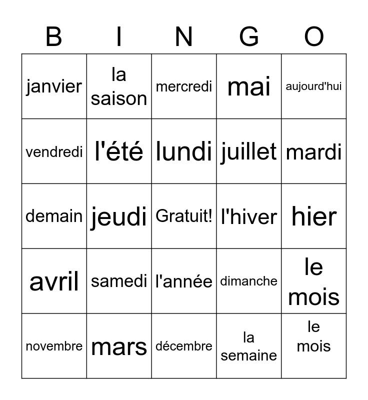 This bingo card has a free space and 24 words: samedi, mars, lundi, novembre, aujourd'hui, janvier, vendredi, la saison, l'hiver, l'année, juillet, demain, dimanche, le mois, l'été, la semaine, hier, mercredi, mardi, jeudi, le mois, avril, mai and décembre.