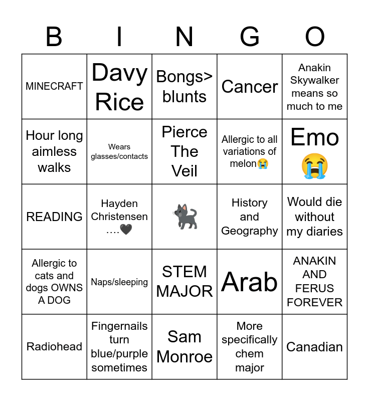 This bingo card has a free space and 24 words: Naps/sleeping, Fingernails turn blue/purple sometimes, Pierce The Veil, Radiohead, Anakin Skywalker means so much to me, MINECRAFT, Hour long aimless walks, Davy Rice, History and Geography, STEM MAJOR, Allergic to all variations of melon😭, READING, Arab, ANAKIN AND FERUS FOREVER, Wears glasses/contacts, More specifically chem major, Would die without my diaries, Bongs> blunts, Emo😭, Hayden Christensen ….🖤, Canadian, Allergic to cats and dogs OWNS A DOG, Cancer and Sam Monroe.