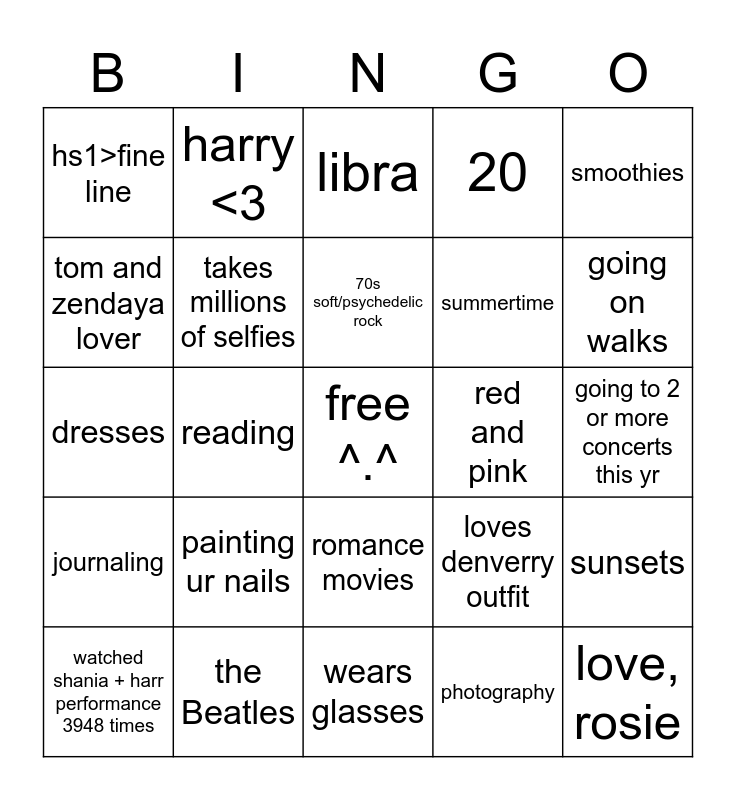 This bingo card has a free space and 24 words: painting ur nails, the Beatles, 70s soft/psychedelic rock, watched shania + harr performance 3948 times, smoothies, hs1>fine line, tom and zendaya lover, harry <3, red and pink, romance movies, summertime, dresses, loves denverry outfit, sunsets, takes millions of selfies, photography, going to 2 or more concerts this yr, libra, going on walks, reading, love, rosie, journaling, 20 and wears glasses.