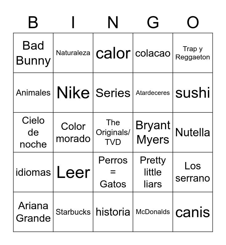 This bingo card has a free space and 24 words: Leer, Starbucks, Series, Ariana Grande, Trap y Reggaeton, Bad Bunny, Animales, Naturaleza, Bryant Myers, Perros = Gatos, Atardeceres, Cielo de noche, Pretty little liars, Los serrano, Nike, McDonalds, Nutella, calor, sushi, Color morado, canis, idiomas, colacao and historia.
