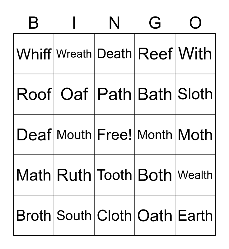 This bingo card has a free space and 24 words: Ruth, South, Path, Broth, With, Whiff, Roof, Wreath, Month, Tooth, Bath, Deaf, Both, Wealth, Oaf, Oath, Moth, Death, Sloth, Mouth, Earth, Math, Reef and Cloth.