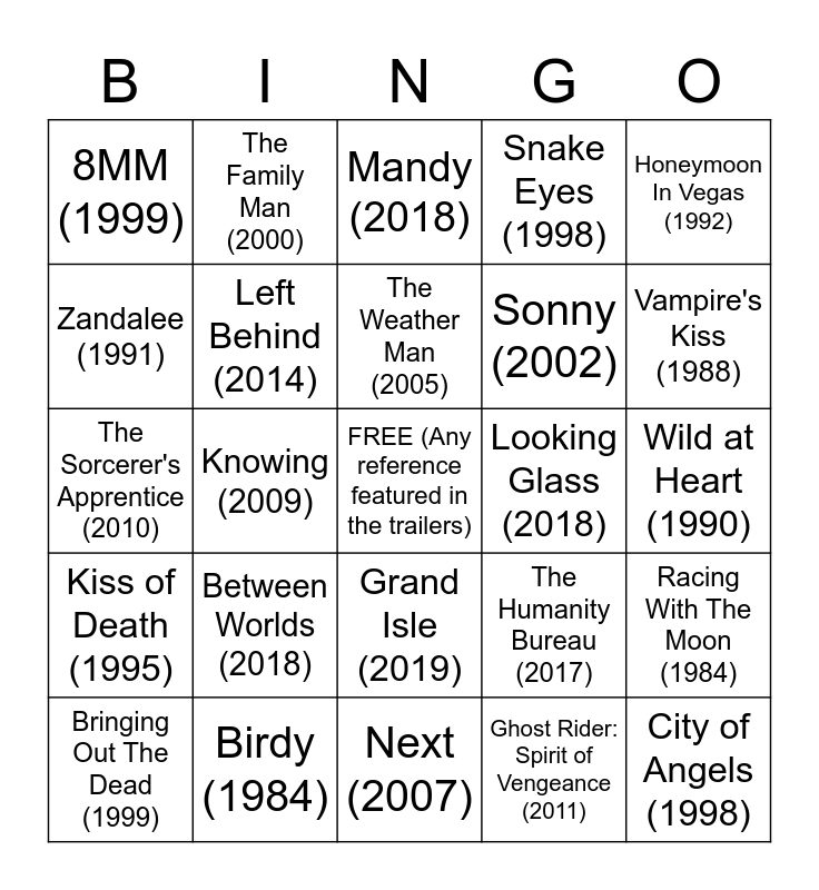 This bingo card has a free space and 24 words: Between Worlds (2018), Birdy (1984), The Weather Man (2005), Bringing Out The Dead (1999), Honeymoon In Vegas (1992), 8MM (1999), Zandalee (1991), The Family Man (2000), Looking Glass (2018), Grand Isle (2019), Sonny (2002), The Sorcerer's Apprentice (2010), The Humanity Bureau (2017), Racing With The Moon (1984), Left Behind (2014), Ghost Rider: Spirit of Vengeance (2011), Wild at Heart (1990), Mandy (2018), Vampire's Kiss (1988), Knowing (2009), City of Angels (1998), Kiss of Death (1995), Snake Eyes (1998) and Next (2007).