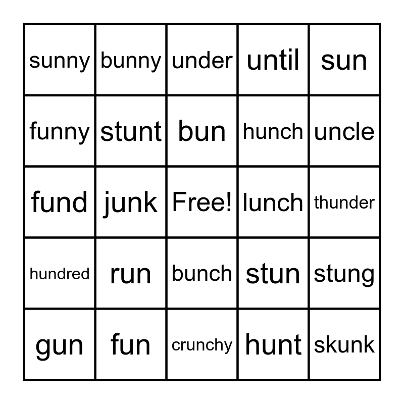 This bingo card has a free space and 24 words: run, fun, bun, gun, sun, sunny, funny, bunny, lunch, bunch, hunch, fund, stun, stung, stunt, hunt, thunder, under, uncle, junk, skunk, hundred, until and crunchy.