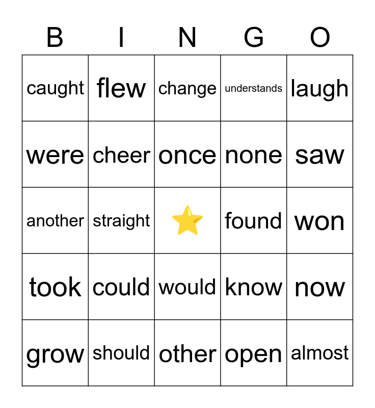 This bingo card has a free space and 24 words: could, should, once, grow, laugh, caught, were, flew, found, would, none, another, know, now, cheer, open, won, change, saw, straight, almost, took, understands and other.