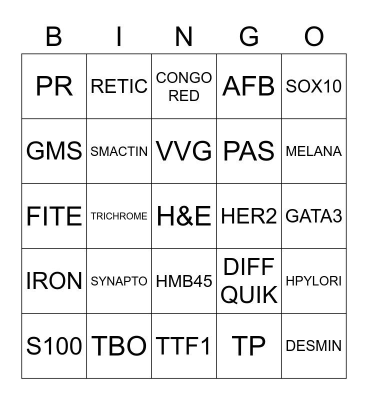 This bingo card has a free space and 24 words: SYNAPTO, TBO, VVG, S100, SOX10, PR, GMS, RETIC, HER2, HMB45, PAS, FITE, DIFF QUIK, HPYLORI, SMACTIN, TP, GATA3, CONGO RED, MELANA, TRICHROME, DESMIN, IRON, AFB and TTF1.
