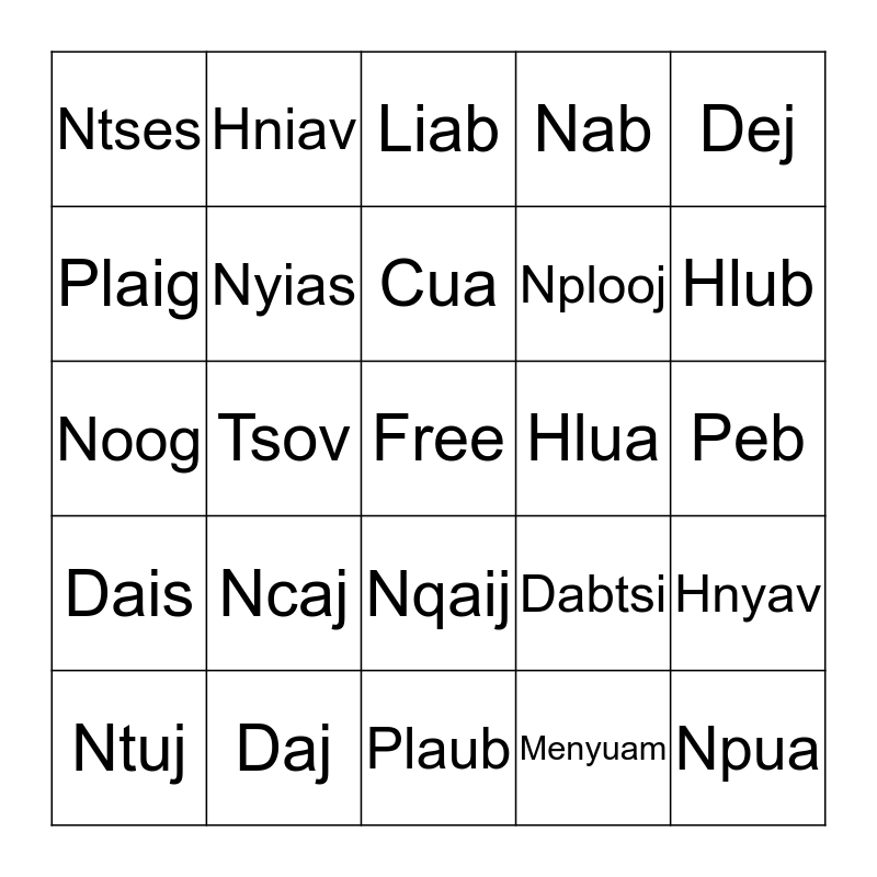 This bingo card has a free space and 24 words: Ncaj, Daj, Cua, Ntuj, Dej, Ntses, Plaig, Hniav, Hlua, Nqaij, Nplooj, Noog, Dabtsi, Hnyav, Nyias, Menyuam, Peb, Liab, Hlub, Tsov, Npua, Dais, Nab and Plaub.