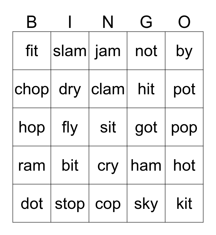 This bingo card has 25 words: bit, cop, clam, dot, by, fit, chop, slam, got, cry, hit, hop, ham, hot, dry, kit, pop, jam, pot, fly, sit, stop, ram, not and sky.