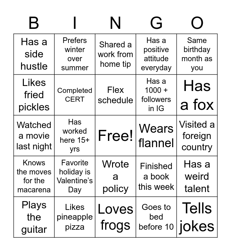 This bingo card has a free space and 26 words: Wrote a policy, Goes to bed before 10, Flex schedule, Likes pineapple pizza, Same birthday month as you, Has a side hustle, Likes fried pickles, Prefers winter over summer, Visited a foreign country, Finished a book this week, Has a 1000 + followers in IG, Watched a movie last night, Has a weird talent, Plays the guitar, Has worked here 15+ yrs, Grows food, Has a positive attitude everyday, Knows the moves for the macarena, Shared a work from home tip, Tells jokes, Has a fox, Loves frogs, Wears flannel, Favorite holiday is Valentine’s Day, Completed CERT and Has never fallen into a porta potty.