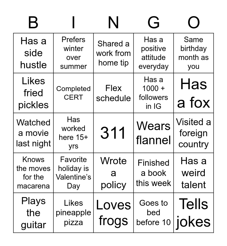 This bingo card has a free space and 26 words: Wrote a policy, Goes to bed before 10, Flex schedule, Likes pineapple pizza, Same birthday month as you, Has a side hustle, Likes fried pickles, Prefers winter over summer, Visited a foreign country, Finished a book this week, Has a 1000 + followers in IG, Watched a movie last night, Has a weird talent, Plays the guitar, Has worked here 15+ yrs, Grows food, Has a positive attitude everyday, Knows the moves for the macarena, Shared a work from home tip, Tells jokes, Has a fox, Loves frogs, Wears flannel, Favorite holiday is Valentine’s Day, Completed CERT and Has never fallen into a porta potty.