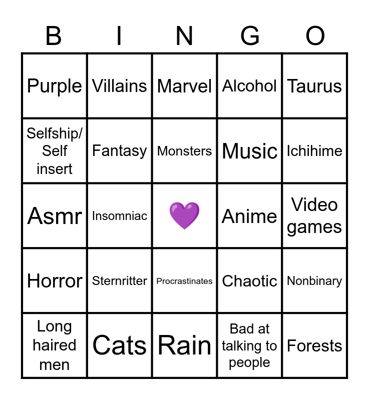 This bingo card has a free space and 24 words: Sternritter, Cats, Monsters, Long haired men, Taurus, Purple, Selfship/ Self insert, Villains, Anime, Procrastinates, Music, Asmr, Chaotic, Nonbinary, Fantasy, Bad at talking to people, Video games, Marvel, Ichihime, Insomniac, Forests, Horror, Alcohol and Rain.