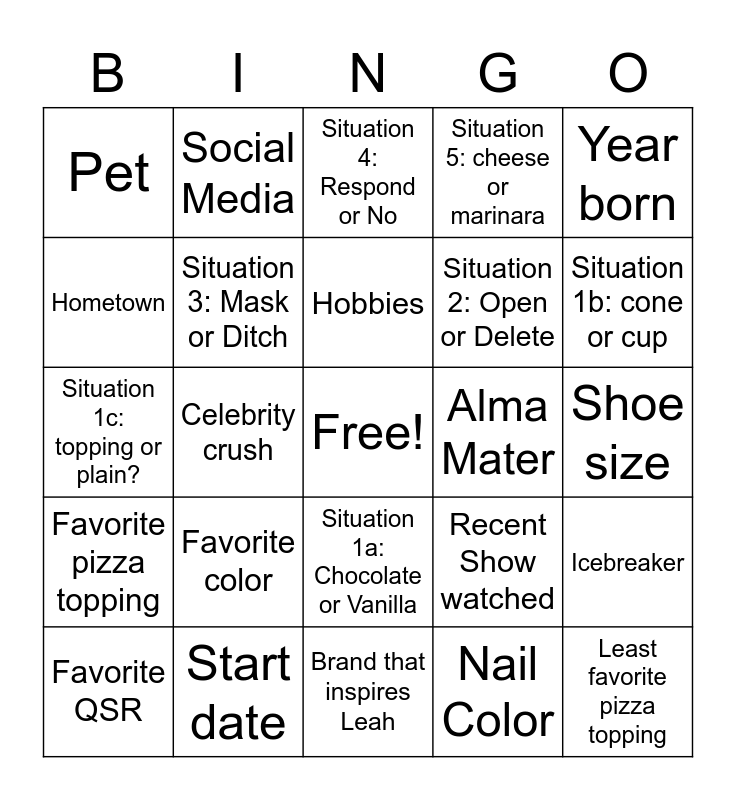 This bingo card has a free space and 24 words: Favorite color, Start date, Hobbies, Favorite QSR, Year born, Pet, Hometown, Social Media, Alma Mater, Situation 1a: Chocolate or Vanilla, Situation 2: Open or Delete, Situation 1c: topping or plain?, Recent Show watched, Icebreaker, Situation 3: Mask or Ditch, Nail Color, Shoe size, Situation 4: Respond or No, Situation 1b: cone or cup, Celebrity crush, Least favorite pizza topping, Favorite pizza topping, Situation 5: cheese or marinara and Brand that inspires Leah.