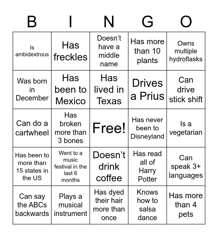 This bingo card has a free space and 25 words: Went to a music festival in the last 6 months, Has dyed their hair more than once, Has lived in Texas, Can say the ABCs backwards, Owns multiple hydroflasks, Is ambidextrous, Was born in December, Has freckles, Has never been to Disneyland, Doesn’t drink coffee, Drives a Prius, Can do a cartwheel, Has read all of Harry Potter, Can speak 3+ languages, Has been to Mexico, Is an only child, Is a vegetarian, Doesn’t have a middle name, Can drive stick shift, Has broken more than 3 bones, Has more than 4 pets, Plays a musical instrument, Has been to more than 15 states in the US, Has more than 10 plants and Knows how to salsa dance.