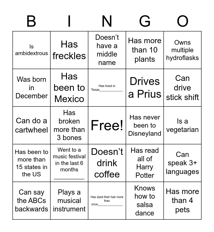 This bingo card has a free space and 25 words: Went to a music festival in the last 6 months __________, Has dyed their hair more than once_______________, Has lived in Texas_____________, Can say the ABCs backwards, Owns multiple hydroflasks, Is ambidextrous, Was born in December, Has freckles, Has never been to Disneyland, Doesn’t drink coffee, Drives a Prius, Can do a cartwheel, Has read all of Harry Potter, Can speak 3+ languages, Has been to Mexico, Is an only child, Is a vegetarian, Doesn’t have a middle name, Can drive stick shift, Has broken more than 3 bones, Has more than 4 pets, Plays a musical instrument, Has been to more than 15 states in the US, Has more than 10 plants and Knows how to salsa dance.