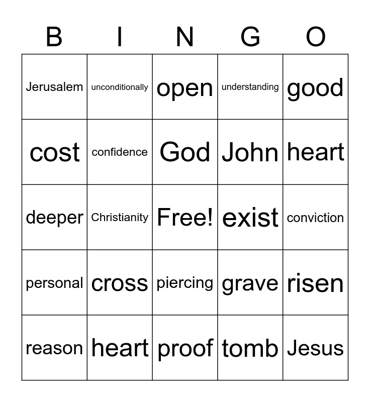 This bingo card has a free space and 53 words: Thomas, Jesus, doubt, tomb, cross, Easter, unconditionally, skepticism, cost, hope, confidence, assurance, risen, grave, resurrection, reason, God, exist, love, good, Christianity, Gospel, John, Jerusalem, all in, heart, disciples, understand, mind, heart, wounds, believe, disappointed, patience, Lord, gentle, understanding, proof, open, struggle, faith, seek, conviction, nail, scar, piercing, empty, fear, deeper, personal, truth, purpose and new.