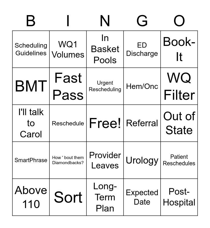 This bingo card has a free space and 34 words: Template Change, Expected Date, Pectus, Decision Tree, SmartPhrase, Fast Pass, Book-It, Above 110, WQ1 Volumes, Medical Records, Urgent Rescheduling, In Basket Pools, Defer, OTG, Referral, WQ Filter, Sort, I'll talk to Carol, How ' bout them Diamondbacks?, Urology, Provider Leaves, Resource Constraints, Scheduling Guidelines, Out of State, Long-Term Plan, Post-Hospital, ED Discharge, fireworks, Hem/Onc, BMT, We Don't Talk About CVD or Bruno, Reschedule, Patient Reschedules and Check Out.