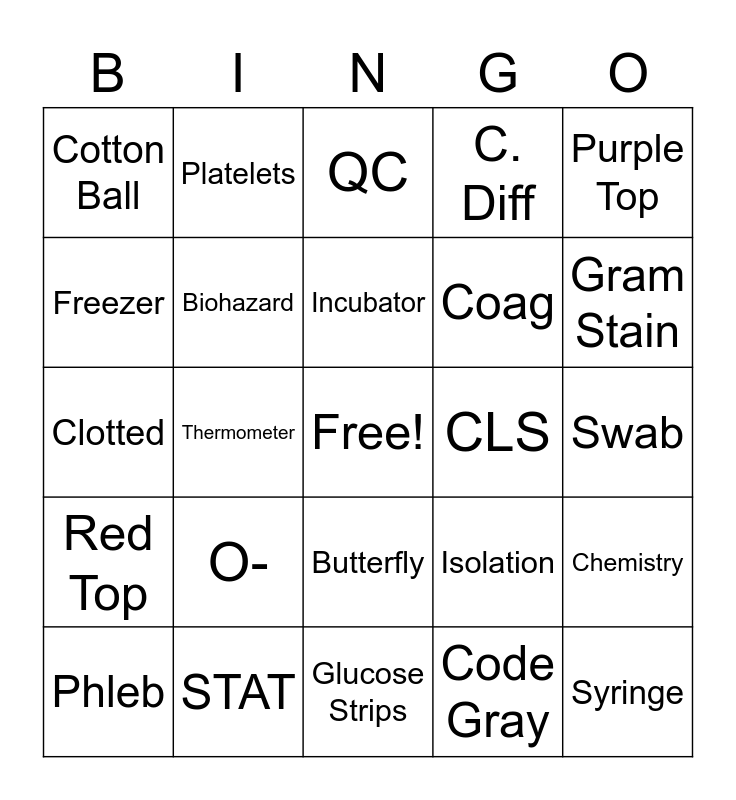This bingo card has a free space and 45 words: STAT, Syringe, Hub, Phleb, Serum, Code Gray, QC, Red Cross, Purple Top, STAT, C. Diff, CLS, Butterfly, O-, Gloves, Glucose Strips, Dr. Patel, Clotted, Tube Rack, Gram Stain, Platelets, BNP, Hemolysis, Cotton Ball, Quest, Swab, Reagent, LACH Lab, Isolation, Red Top, UA, Chemistry, Specimen, Mask, Urine, Thermometer, Band-Aid, Anaerobe, Loop, Incubator, Freezer, Coag, Controls, Biohazard and Timer.