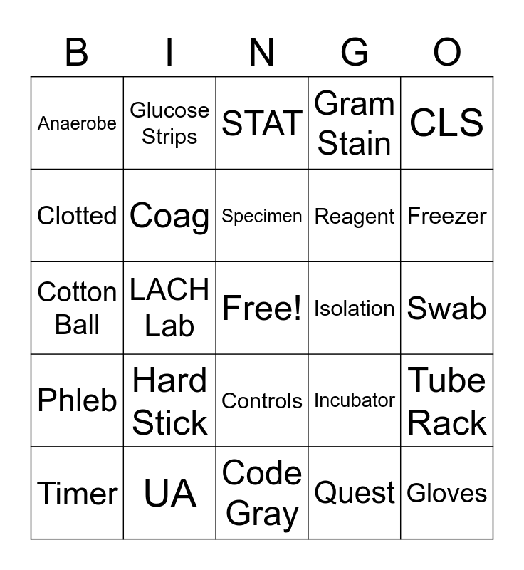 This bingo card has a free space and 45 words: Biohazard, Gloves, Hemolysis, Timer, Red Cross, Quest, STAT, Thermometer, CLS, UA, Gram Stain, Isolation, Controls, Hard Stick, Loop, Code Gray, Platelets, Cotton Ball, Purple Top, Freezer, Glucose Strips, Urine, C. Diff, Anaerobe, Serum, Swab, Red Top, Butterfly, Incubator, Phleb, Chemistry, Tube Rack, Mask, Dr. Patel, Syringe, LACH Lab, Hub, Band-Aid, O-, Specimen, Clotted, Reagent, QC, Coag and BNP.
