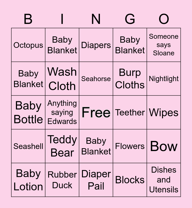 This bingo card has a free space and 29 words: Baby Blanket, Rubber Duck, Diapers, Baby Clothes, Someone says Sloane, Octopus, Wash Cloth, Seahorse, Teether, Bow, Baby Lotion, Anything saying Edwards, Blocks, Dishes and Utensils, Baby Bottle, Cardboard Book, Diaper Pail, Flowers, Nightlight, Seashell, Teddy Bear, Baby Monitor, Burp Cloths, Wipes, Baby Blanket, Baby Blanket, Baby Blanket, Baby Blanket and Baby Blanket.