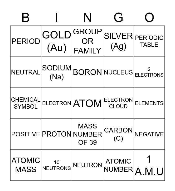 This bingo card has a free space and 24 words: PROTON, 10 NEUTRONS, BORON, ATOMIC MASS, PERIODIC TABLE, PERIOD, NEUTRAL, GOLD (Au), ELECTRON CLOUD, MASS NUMBER OF 39, NUCLEUS, CHEMICAL SYMBOL, CARBON (C), NEGATIVE, SODIUM (Na), ATOMIC NUMBER, ELEMENTS, GROUP OR FAMILY, 2 ELECTRONS, ELECTRON, 1 A.M.U, POSITIVE, SILVER (Ag) and NEUTRON.