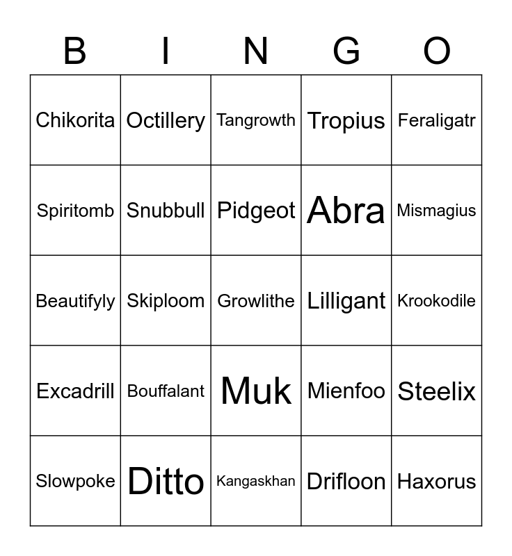 This bingo card has 25 words: Bouffalant, Kangaskhan, Pidgeot, Slowpoke, Feraligatr, Chikorita, Spiritomb, Octillery, Lilligant, Muk, Abra, Beautifyly, Mienfoo, Steelix, Snubbull, Haxorus, Krookodile, Tangrowth, Mismagius, Skiploom, Growlithe, Ditto, Excadrill, Tropius and Drifloon.