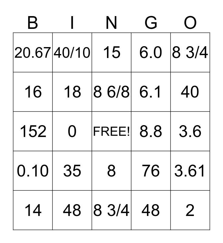This bingo card has a free space and 24 words: 35, 48, 8 6/8, 14, 8 3/4, 20.67, 16, 40/10, 8.8, 8, 6.1, 152, 76, 3.61, 18, 48, 3.6, 15, 40, 0, 2, 0.10, 6.0 and 8 3/4.