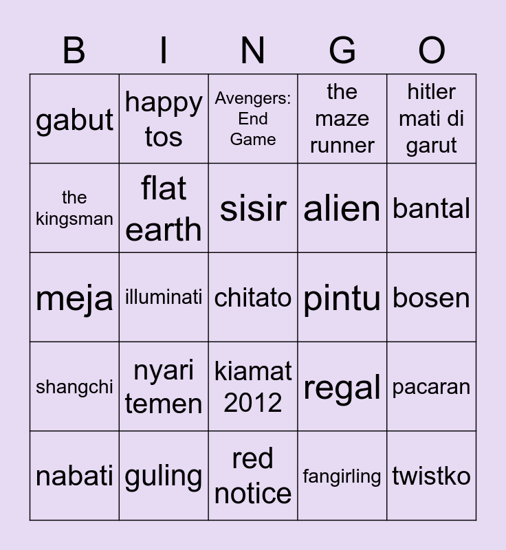 This bingo card has 25 words: shangchi, guling, chitato, fangirling, hitler mati di garut, gabut, happy tos, Avengers: End Game, pintu, pacaran, the kingsman, flat earth, red notice, regal, bantal, nabati, illuminati, sisir, alien, bosen, meja, nyari temen, kiamat 2012, the maze runner and twistko.
