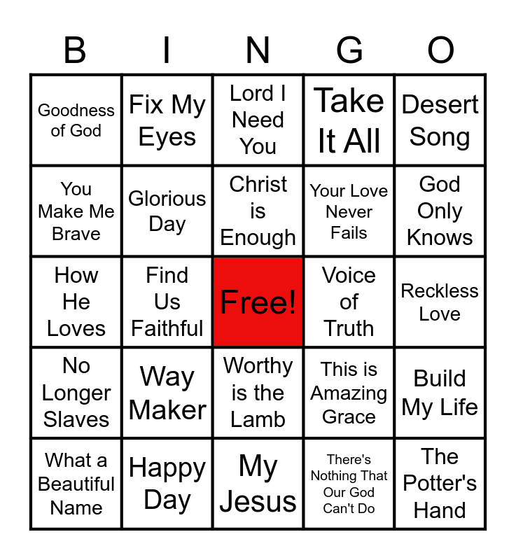 This bingo card has a free space and 24 words: Way Maker, Happy Day, Christ is Enough, What a Beautiful Name, Desert Song, Goodness of God, You Make Me Brave, Fix My Eyes, Voice of Truth, Worthy is the Lamb, Your Love Never Fails, How He Loves, This is Amazing Grace, Build My Life, Glorious Day, There's Nothing That Our God Can't Do, Reckless Love, Lord I Need You, God Only Knows, Find Us Faithful, The Potter's Hand, No Longer Slaves, Take It All and My Jesus.