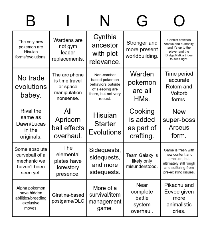 This bingo card has a free space and 24 words: The elemental plates have lore/story presence., Giratina-based postgame/DLC, Non-combat based pokemon behaviors outside of sleeping are there, but not very robust., Alpha pokemon have hidden abilities/breeding exclusive moves., Conflict between Arceus and humanity, and it's up to the player and the Dialga/Palkia tribes to set it right., The only new pokemon are Hisuian forms/evolutions., No trade evolutions babey., Wardens are not gym leader replacements., Cooking is added as part of crafting., Sidequests, sidequests, and more sidequests., Warden pokemon are all HMs., Rival the same as Dawn/Lucas in the originals., Team Galaxy is likely only misunderstood., Game is fresh with new content and ambition, but ultimately still rough and suffering from pre-existing issues., The arc phone is time travel or space manipulation nonsense., Near complete battle system overhaul., New super-boss Arceus form., Cynthia ancestor with plot relevance., Time period accurate Rotom and Voltorb forms., All Apricorn ball effects overhaul., Pikachu and Eevee given more animalistic cries., Some absolute curveball of a mechanic we haven't been seen yet., Stronger and more present worldbuilding. and More of a survival/item management game..