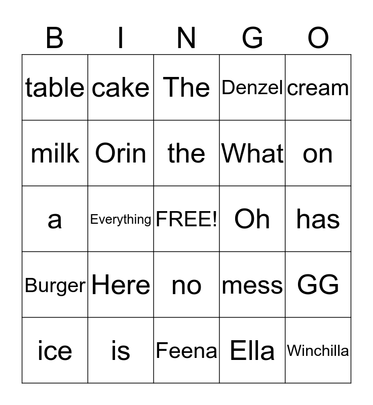This bingo card has a free space and 24 words: Here, is, the, ice, cream, table, milk, cake, Oh, no, What, a, mess, GG, Orin, Ella, has, The, on, Everything, Winchilla, Burger, Denzel and Feena.