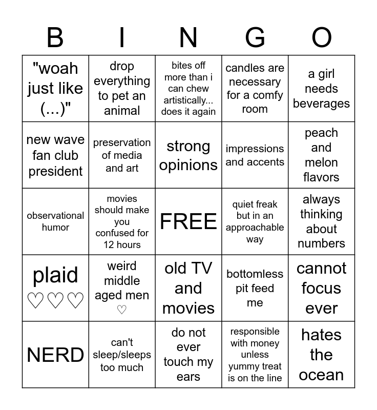 This bingo card has a free space and 24 words: weird middle aged men ♡, can't sleep/sleeps too much, strong opinions, NERD, a girl needs beverages, "woah just like (...)", new wave fan club president, drop everything to pet an animal, quiet freak but in an approachable way, old TV and movies, impressions and accents, observational humor, bottomless pit feed me, cannot focus ever, preservation of media and art, responsible with money unless yummy treat is on the line, always thinking about numbers, bites off more than i can chew artistically... does it again, peach and melon flavors, movies should make you confused for 12 hours, hates the ocean, plaid ♡♡♡, candles are necessary for a comfy room and do not ever touch my ears.