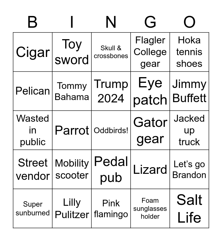 This bingo card has a free space and 24 words: Mobility scooter, Lilly Pulitzer, Trump 2024, Super sunburned, Hoka tennis shoes, Cigar, Pelican, Toy sword, Gator gear, Pedal pub, Eye patch, Wasted in public, Lizard, Let’s go Brandon, Tommy Bahama, Foam sunglasses holder, Jacked up truck, Skull & crossbones, Jimmy Buffett, Parrot, Salt Life, Street vendor, Flagler College gear and Pink flamingo.