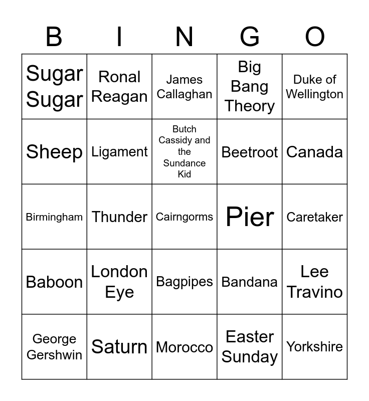 This bingo card has a free space and 39 words: Nottingham, Lake Superior, Dexy's Midnight Runners, Ligament, George Gershwin, Bagpipes, Butch Cassidy and the Sundance Kid, Zeus, Duke of Wellington, Baboon, Thunder, Big Bang Theory, Yorkshire, Caretaker, Pier, London Eye, Edward Jenner, Sugar Sugar, Books, Bandana, Sheep, Morocco, Beetroot, Canada, The prevelant cooling sea breeze, Lancaster, The UK and Iceland, Avacodo, Carousel, Ronal Reagan, Tiger, Royal Society, James Callaghan, Saturn, Easter Sunday, Jack Nicholson, Lee Travino, Birmingham and Green.