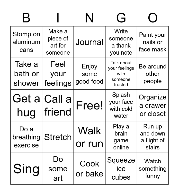 This bingo card has a free space and 29 words: Sing, Dance, Call a friend, Rip up paper, Stomp on aluminum cans, Journal, Feel your feelings, Stretch, Splash your face with cold water, Do some art, Organize a drawer or closet, Watch something funny, Cook or bake, Squeeze ice cubes, Be around other people, Call a crisis line if no one is around to talk, Walk or run, Do a breathing exercise, Paint your nails or face mask, Get a hug, Play a brain game online, Break sticks, Talk about your feelings with someone trusted, Take a bath or shower, Write someone a thank you note, Make a piece of art for someone, Run up and down a flight of stairs, Enjoy some good food and Drink water.